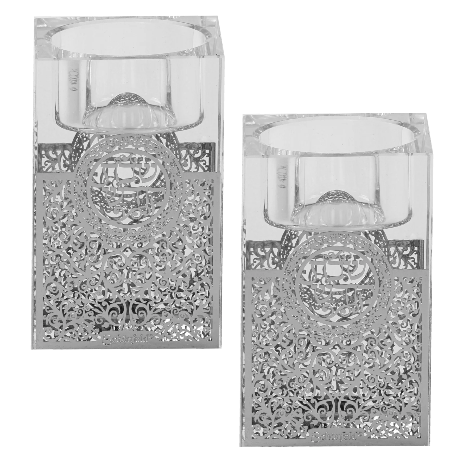 The combination of clear lucite and detailed metallic scrollwork creates a striking two-tone effect that blends modern design with classic Judaica artistry. When lit, the candle casts a warm glow through the delicate cut-out pattern, enhancing the atmosphere of your Shabbat and Yom Tov table.